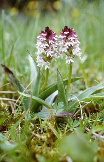 Auch das Brandknabenkraut (Orchis ustulata) bevorzugt die tiefgründigeren Kalksandrasen der Wacholderheide.