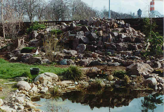 Morgensonne die feuchtigkeitsempfindlichen Pflanzen. Die Sonnenseite der Porphyranlage teilen sich Pflanzenarten aus den mittleren bis südlichen Rocky Mountains, einige Südamerikanische Arten sowie Trockenheitsverträgliche Arten aus Kleinasien und den iberischen Gebirgen. Obwohl ich die Standorttrennung anstrebe, ist eine unmittelbare Arealtrennung nach Herkunft aus Platzgründen leider nicht immer möglich. Eine weitere kleinklimatische Ausformung der Standorte wird durch gezielte Gehölzpflanzung unterstützt. Durch den Einbau einiger Gehölze in den Steingarten selbst oder die gezielte Beschattungspflanzung am Rand schafft man in Kombination mit der Hangneigung ein kleinflächiges Mosaik unterschiedlicher Standorte. So sichert der lichte Schatten einer Birke auf der absonnigen Seite ausreichend gute Standortbedingungen für lichtliebende Arten der kalten Böden subarktischer Gebiete und der Alpenhochlagen, die die sommerliche Bodenaufheizung schlecht vertragen. Latschenkiefern und Felsenbirne sorgen durch die bodennahe Beschattung für bessere Luftfeuchteverhältnisse in den warmen Monaten. Unterstützt wird die sommerliche Temperierung der absonnigen Seite durch den integrierten Bachlauf (Zeitschaltuhr) und abendliches Übersprühen. |