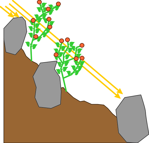 Prinzip des absonnigen Standortes: Die Neigung des Hanges ist am Winkel des höchsten Sonnenstandes so auszurichten, dass der Wuchsort der Pflanze selbst im Schatten liegt, die Pflanze selbst jedoch "in die Sonne" wachsen kann. Auf diese Weise erreicht man einen nicht schnell austrocknenden, aber doch sonnigen Standort.