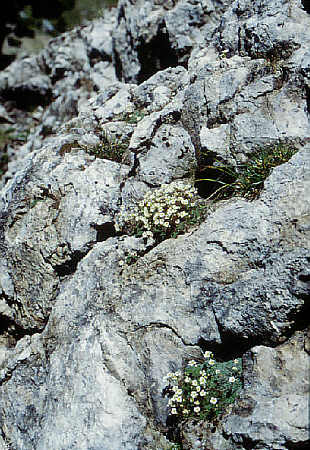 Saxifraga caesia und Saxifraga sqarrosa am natürlichen Standort am Passo Pardoi in den Dolomiten. Die kompakten Polster haben sich kleinste Steinspalten erobert.