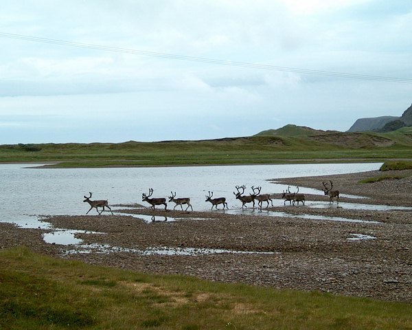 Eine Rentierheder ist zwischen den naturgeschützten Dünenzügen auf der Varanger-Halbinsel unterwegs.