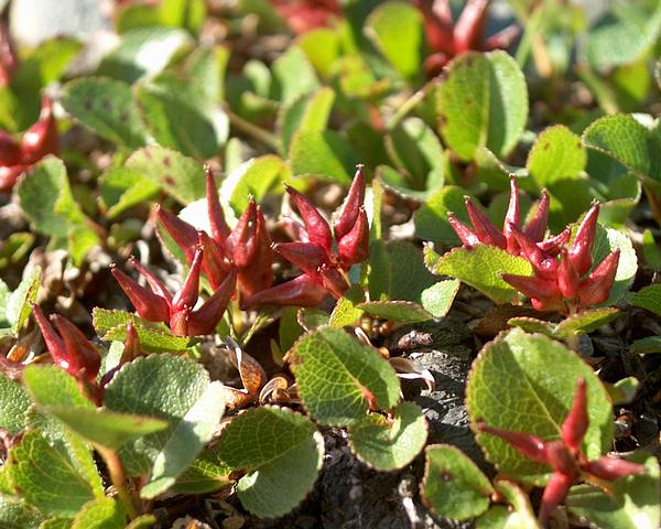 Blühende Krautweide (Salix herbacea). Sie bildet oft ausgedehnte Matten auf Rohböden und zwischen grobem Verwitterungsschutt.