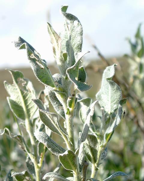 Die Lappweide, Salix lapponica, wirkt durch die dichte Behharung auf den Blättern fast weiß. Sie ist Bestandsbildner der Grauweiden-Zone des Nordens.
