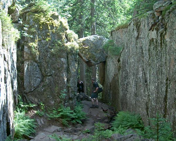 Slattdalsskrevan: Man nimmt an, dass über Jahrmillionen weichere Gesteinsschichten aus dem widerstandsfähigen roten Granit herausgewittert sind. Nachbrechende Blöcke blieben in den Schluchten einfach hängen.