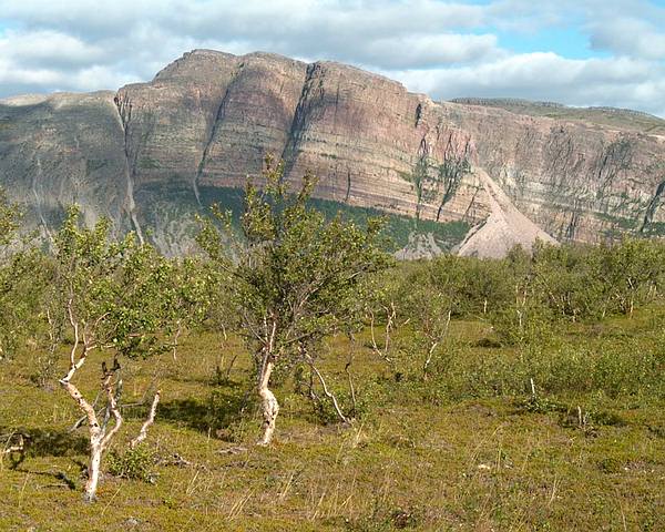 Aus der weiten Ebene der Tana-Mündung, teilweise mit lockerem Fjellbirkenwald bestanden, erhebt sich der Ostrand des alten Kaledonischen Gebirges, geprägt von kristallinen Sandsteine in fast ungestörter Schichtung. Einige Kilometer nordwestlich steht man schon auf den Gesteinen des darunter liegenden Grundgebirges, zerrissen von den Störungen der Timaniden. Schon wenige Kilometer südwestlich dagegen liegen die vom Inlandeis rundgeschliffenen kristallinen "Buckelberge" der alten Fennoskandischen Platte. |